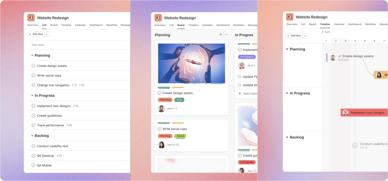 Manage your projects from start to finish. With all of your projects in Asana, you’ll always know who’s doing what, by when.
